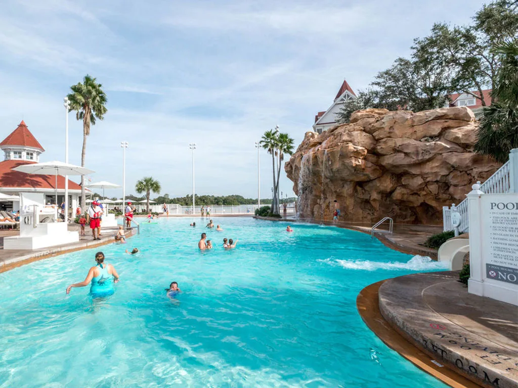 The Grand Floridian features two heated outdoor pools: the Beach Pool, which includes a waterslide, waterfall, and splash area for kids, and the Courtyard Pool, a quieter option perfect for relaxing with a book or enjoying the whirlpool spa.